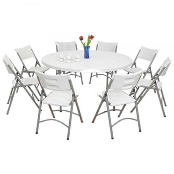 Beautiful set of 5 Round white table 60″ with 40 white folding chairs